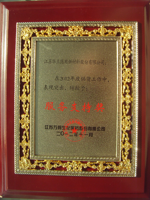 2012年,我公司憑借優質的產品質量和服務得到江蘇萬邦生化醫藥股份有限公司的認可,并授予“服務支持獎”。